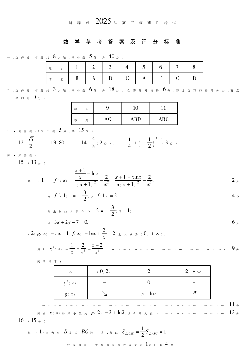 安徽省蚌埠市2025届高三年级上学期8月调研性考试+数学答案
