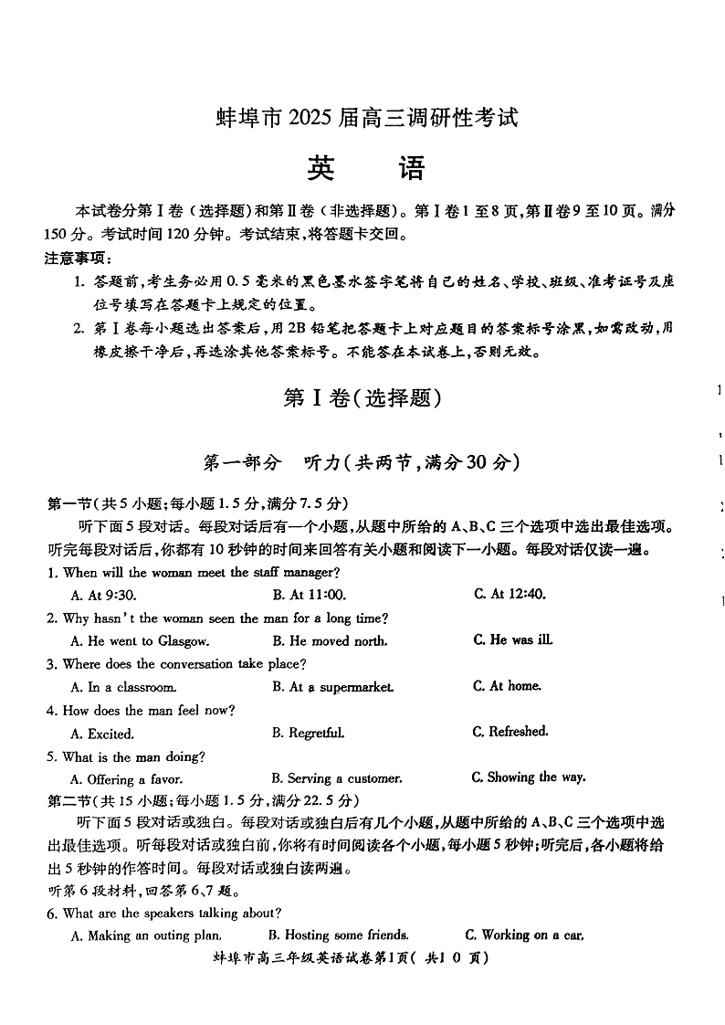 安徽省蚌埠市2025届高三年级上学期8月调研性考试+英语