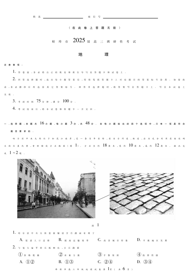 安徽省蚌埠市2025届高三年级上学期8月调研性考试+地理