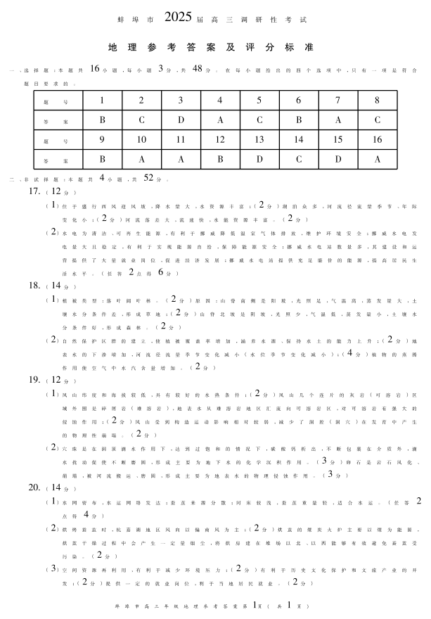 安徽省蚌埠市2025届高三年级上学期8月调研性考试+地理答案