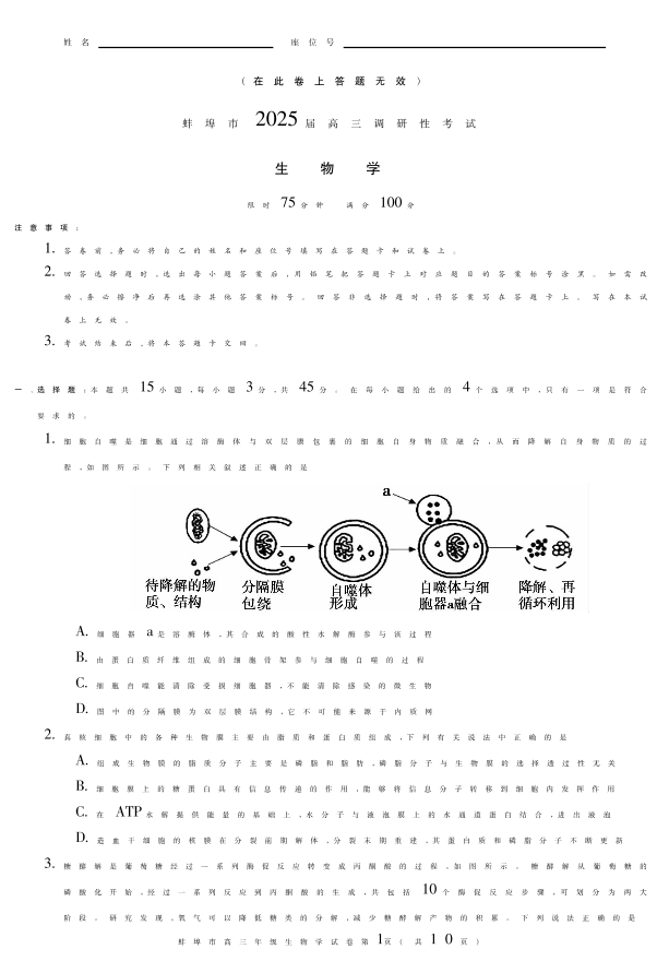 安徽省蚌埠市2025届高三年级上学期8月调研性考试+生物
