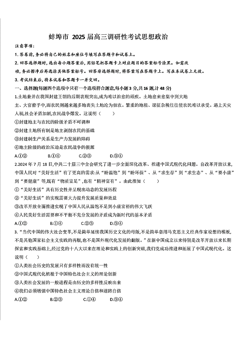 安徽省蚌埠市2025届高三年级上学期8月调研性考试+政治
