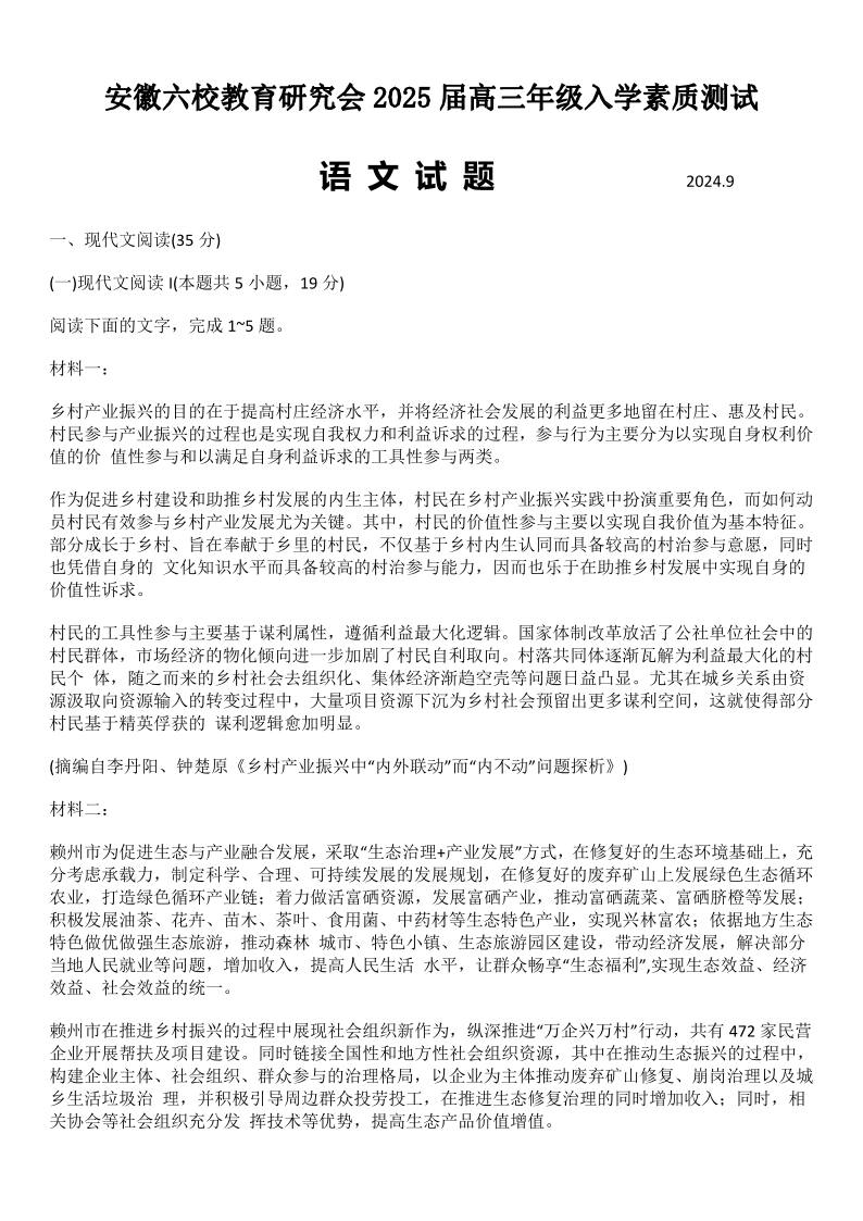 安徽省六校教育研究会2025届高三年级入学素质测试+语文