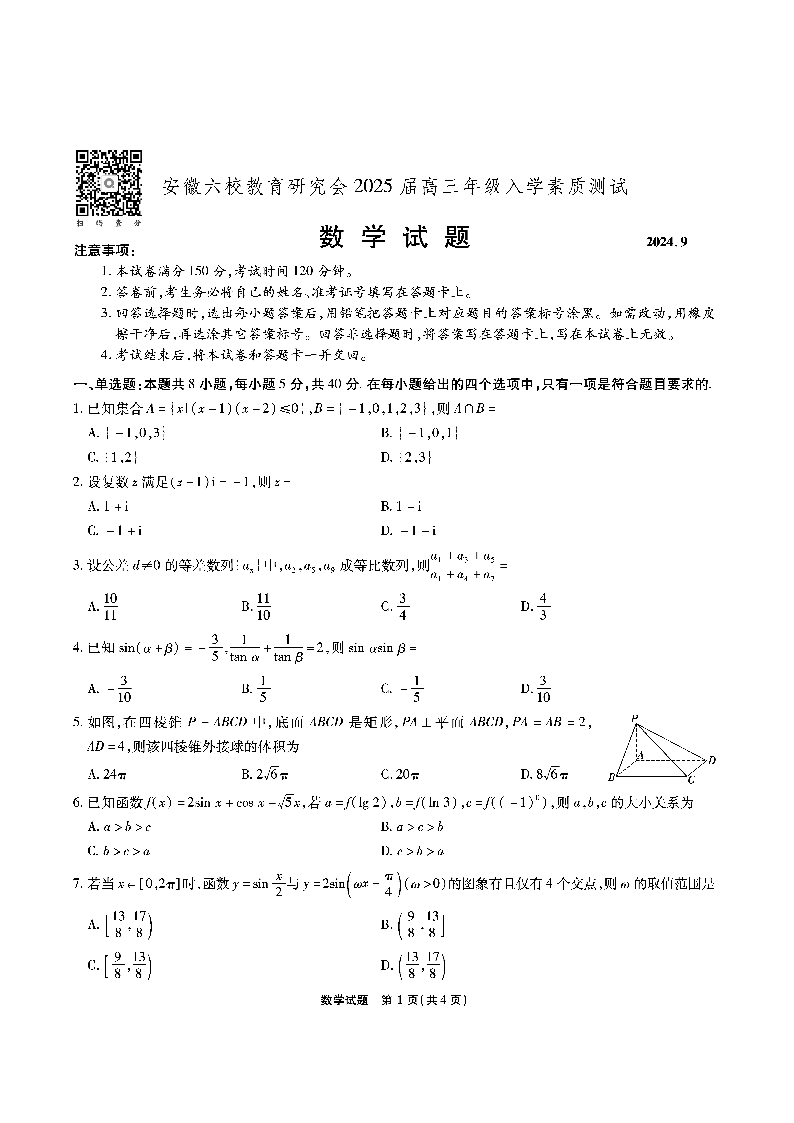 安徽省六校教育研究会2025届高三年级入学素质测试+数学