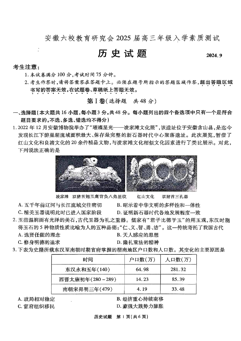 安徽省六校教育研究会2025届高三年级入学素质测试+历史