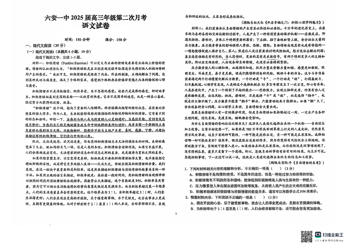 安徽省六安第一中学2024-2025学年高三上学期9月月考+语文