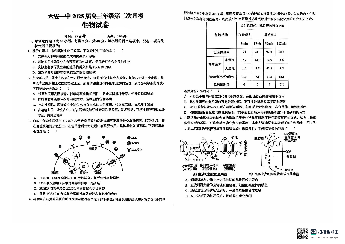 安徽省六安第一中学2024-2025学年高三上学期9月月考+生物