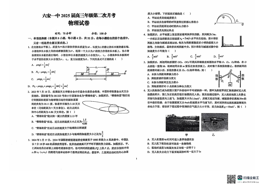 安徽省六安第一中学2024-2025学年高三上学期9月月考+物理