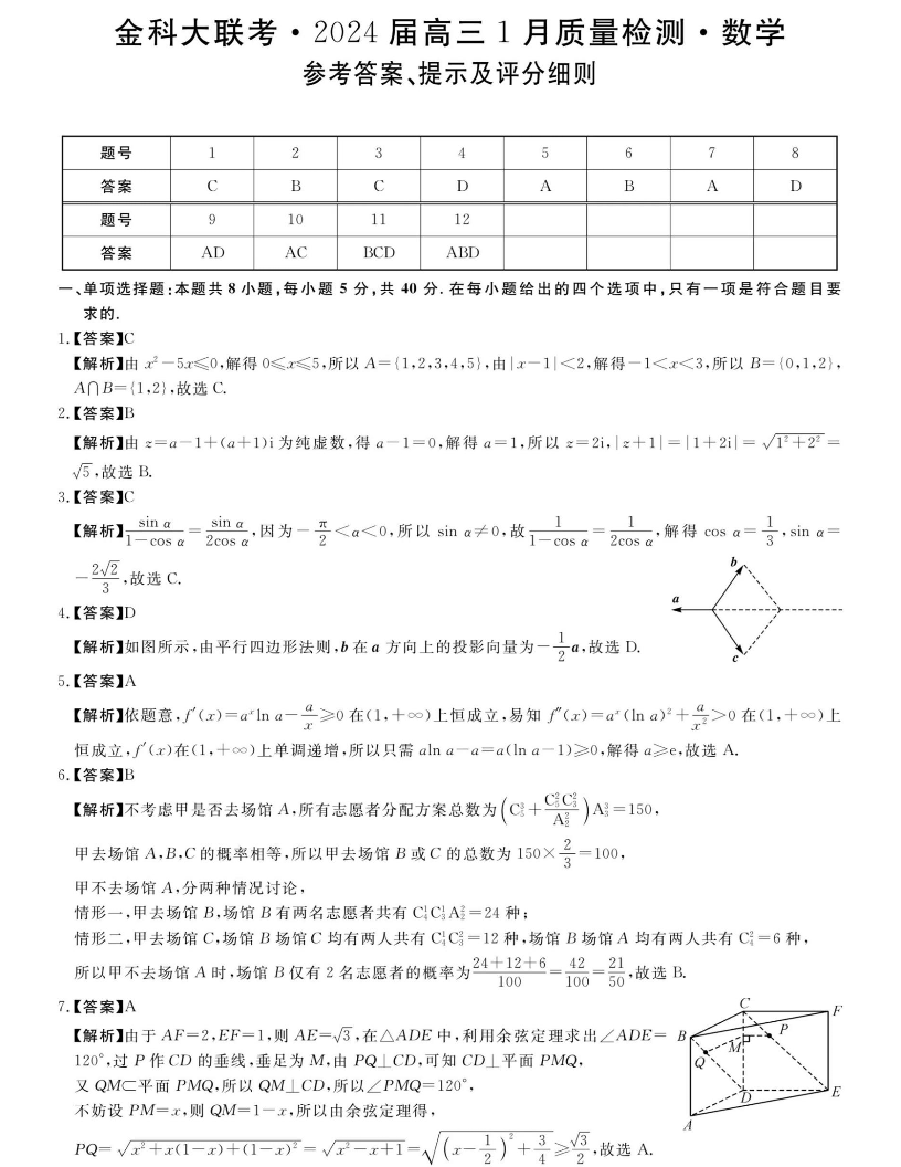 河北省金科大联考2023-2024学年高三上学期1月质量检测 数学答案