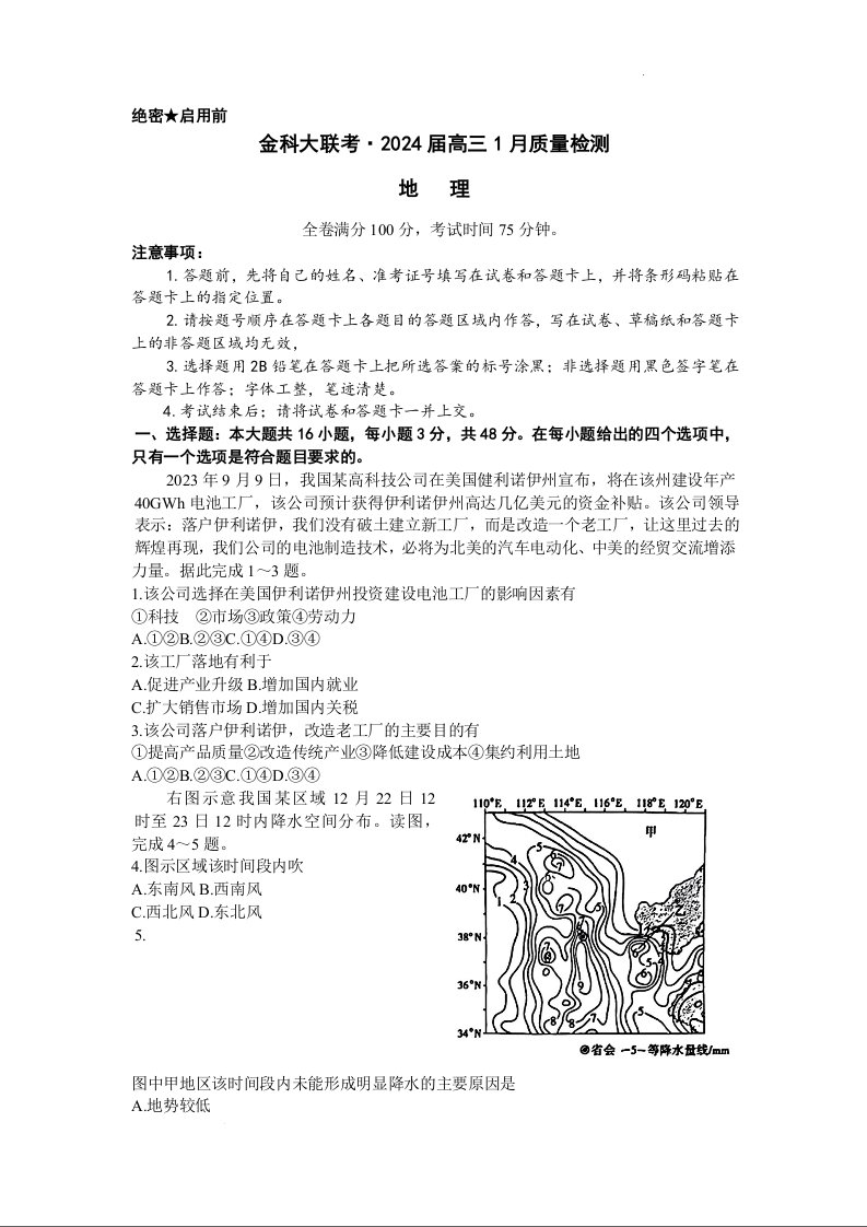 河北省金科大联考2023-2024学年高三上学期1月质量检测 地理