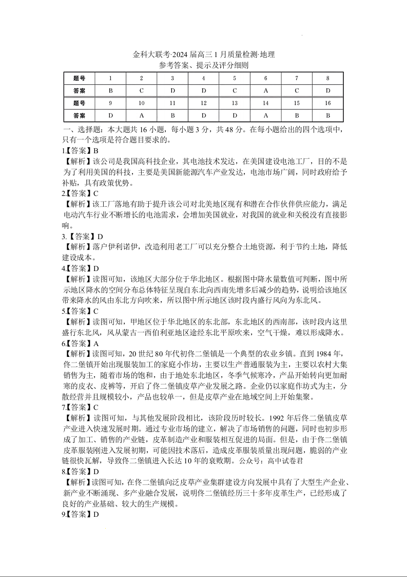 河北省金科大联考2023-2024学年高三上学期1月质量检测 地理答案