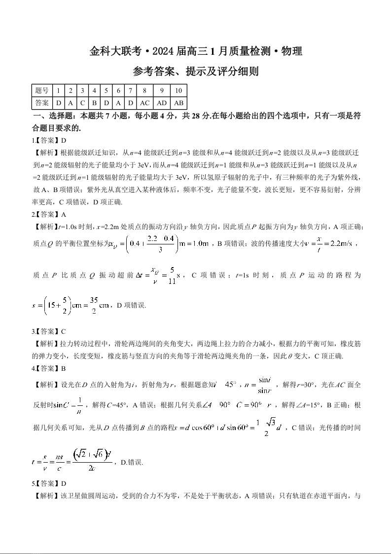 河北省金科大联考2023-2024学年高三上学期1月质量检测 物理答案