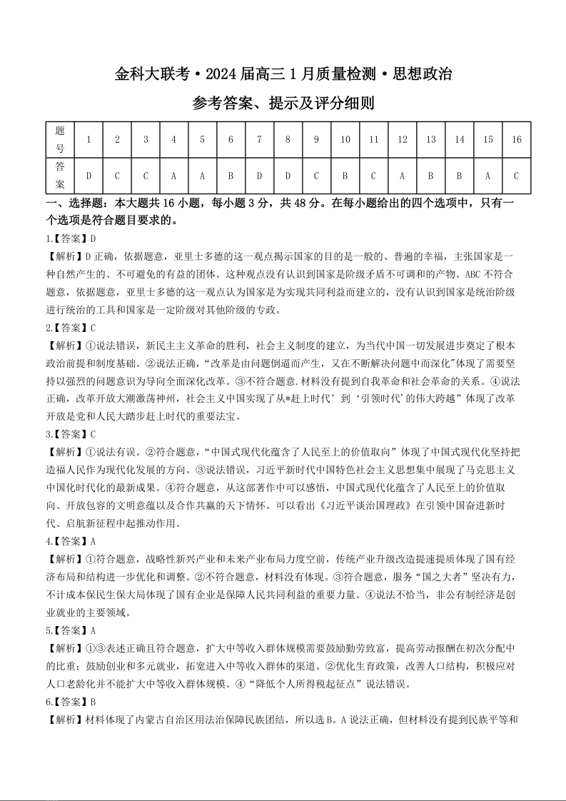 河北省金科大联考2023-2024学年高三上学期1月质量检测 政治答案