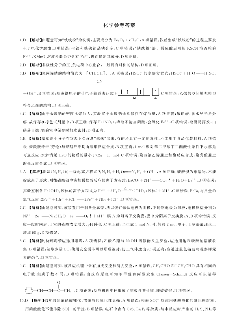 2024届百师联盟2023届高三一轮复习(五)化学答案