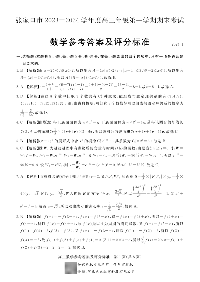 河北省张家口市2023-2024学年高三上学期1月期末考试 数学答案