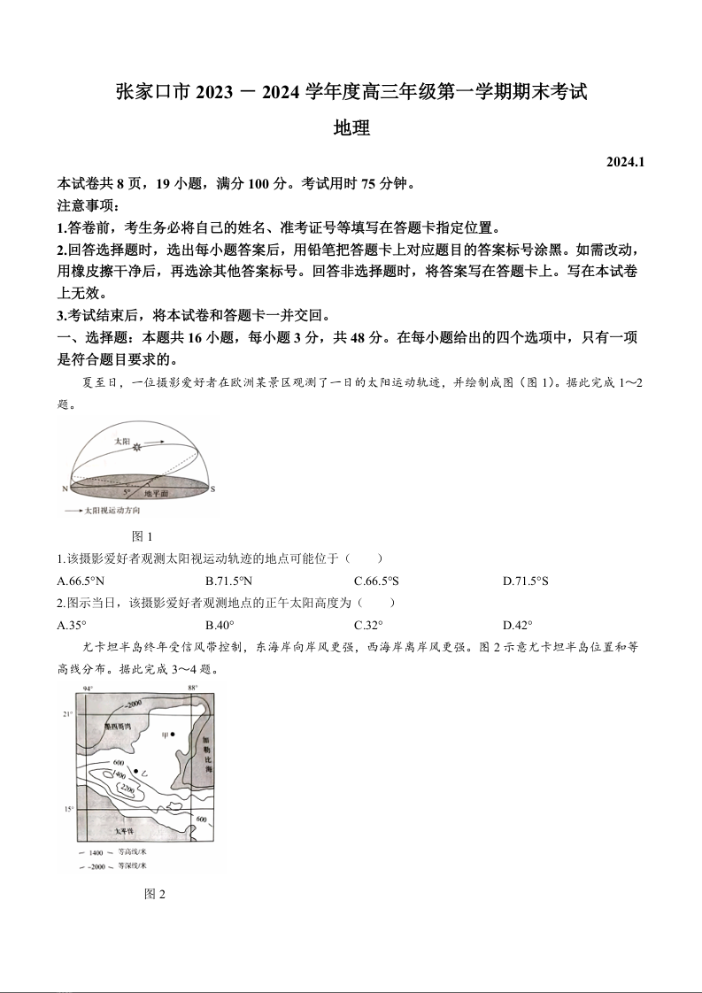 河北省张家口市2023-2024学年高三上学期1月期末考试 地理