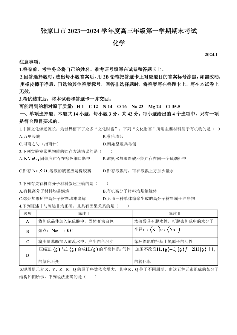 河北省张家口市2023-2024学年高三上学期1月期末考试 化学