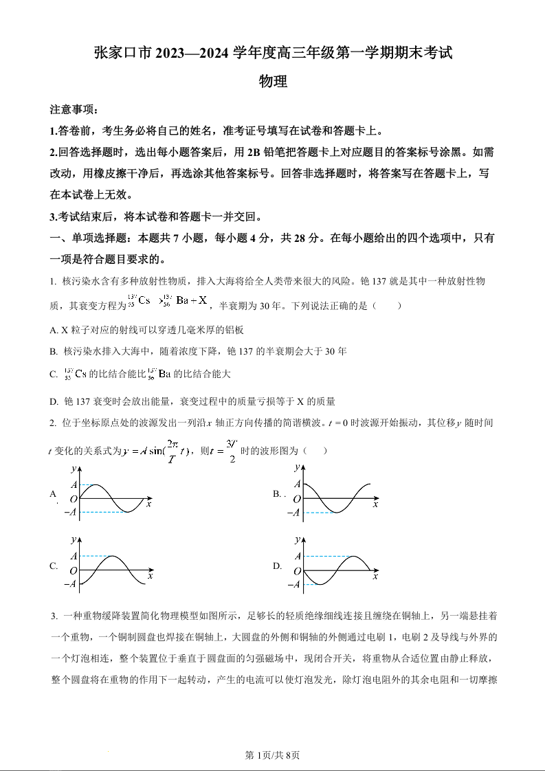 河北省张家口市2023-2024学年高三上学期1月期末考试 物理