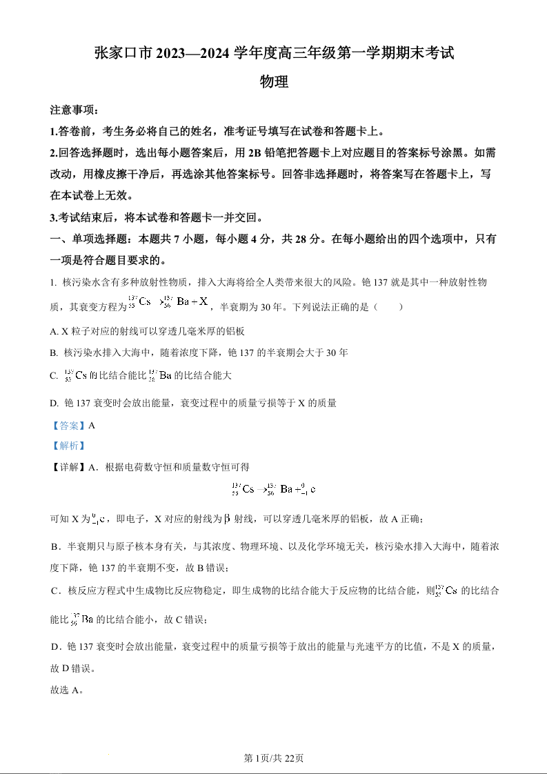 河北省张家口市2023-2024学年高三上学期1月期末考试 物理答案