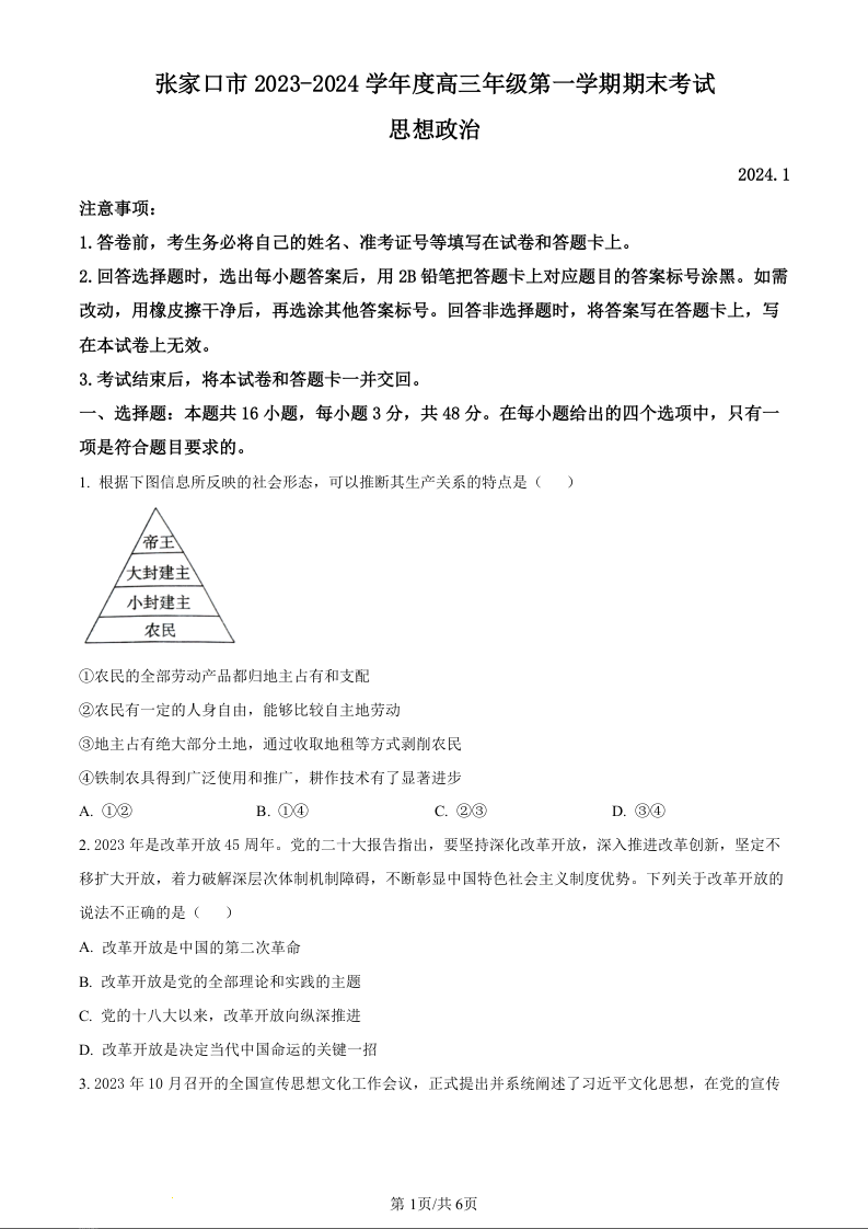 河北省张家口市2023-2024学年高三上学期1月期末考试 政治