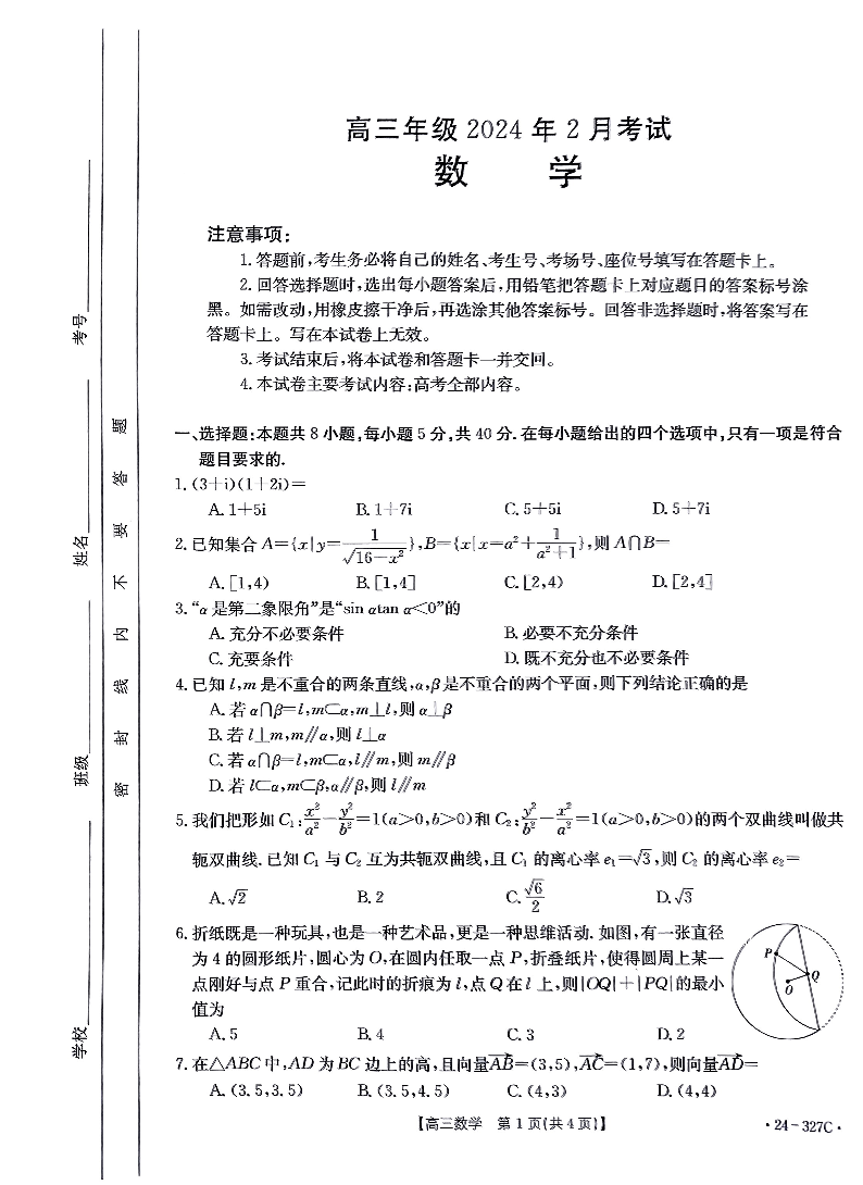 河北省部分重点高中2023-2024学年高三上学期期末考试 数学