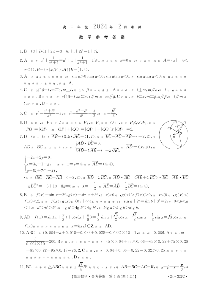 河北省部分重点高中2023-2024学年高三上学期期末考试 数学答案