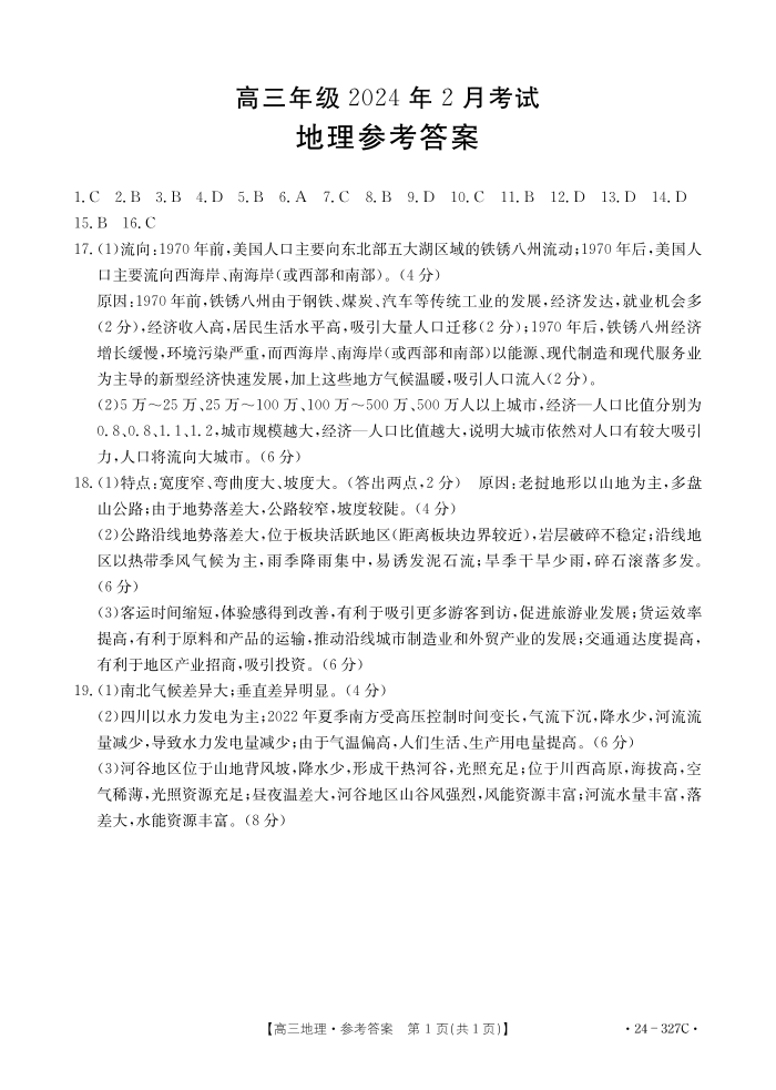 河北省部分重点高中2023-2024学年高三上学期期末考试 地理答案