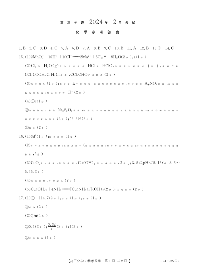 河北省部分重点高中2023-2024学年高三上学期期末考试 化学答案