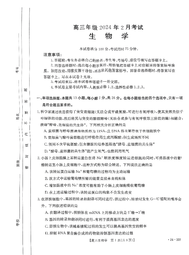 河北省部分重点高中2023-2024学年高三上学期期末考试 生物