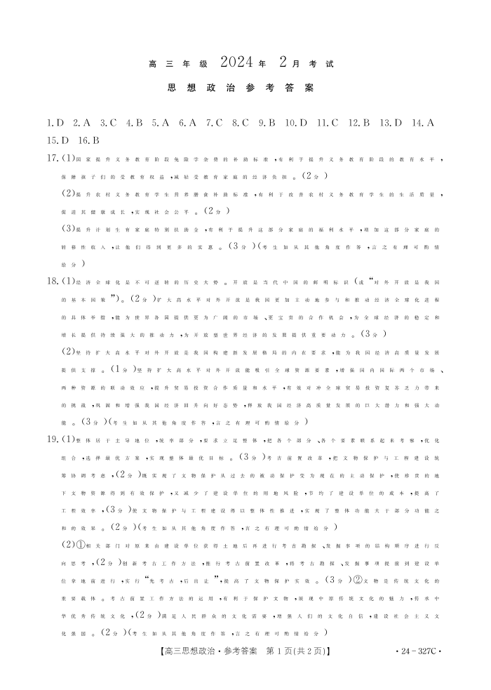 河北省部分重点高中2023-2024学年高三上学期期末考试 政治答案