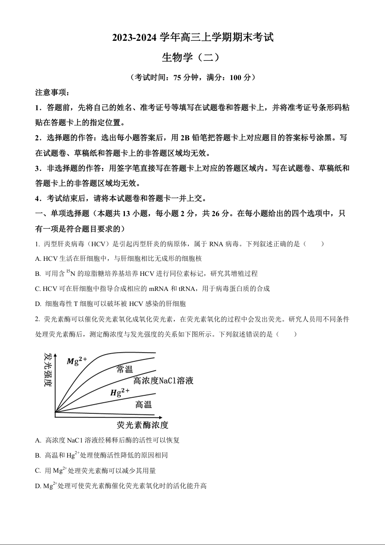 河北省保定市部分高中2023-2024学年高三上学期1月期末考试 生物