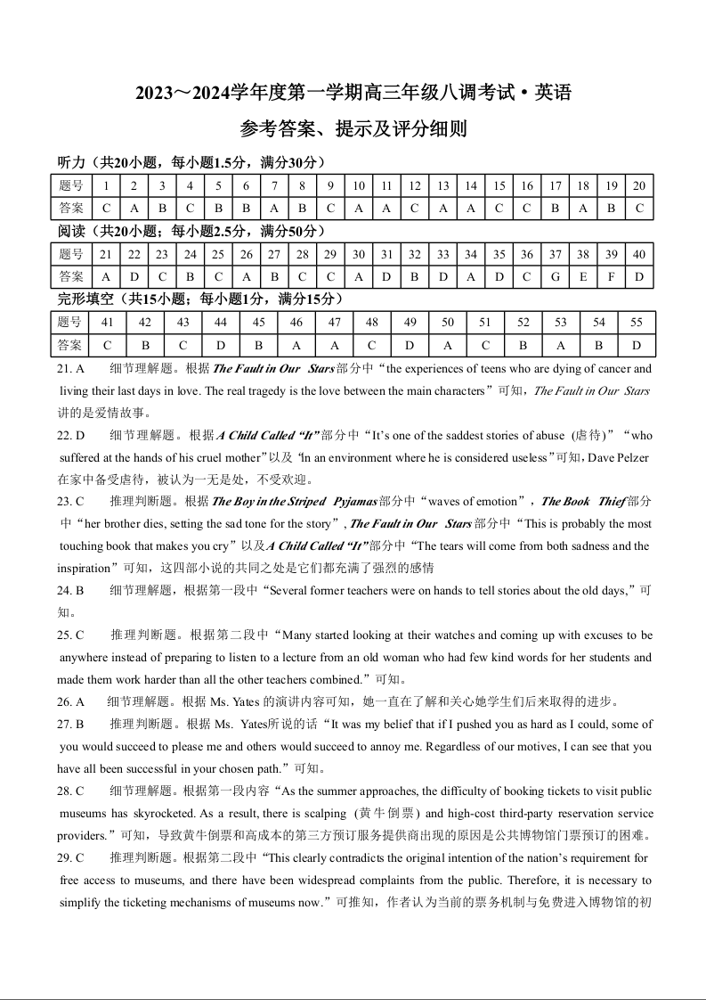 河北省邯郸市磁县第一中学2023-2024学年高三上学期八调考试 英语答案