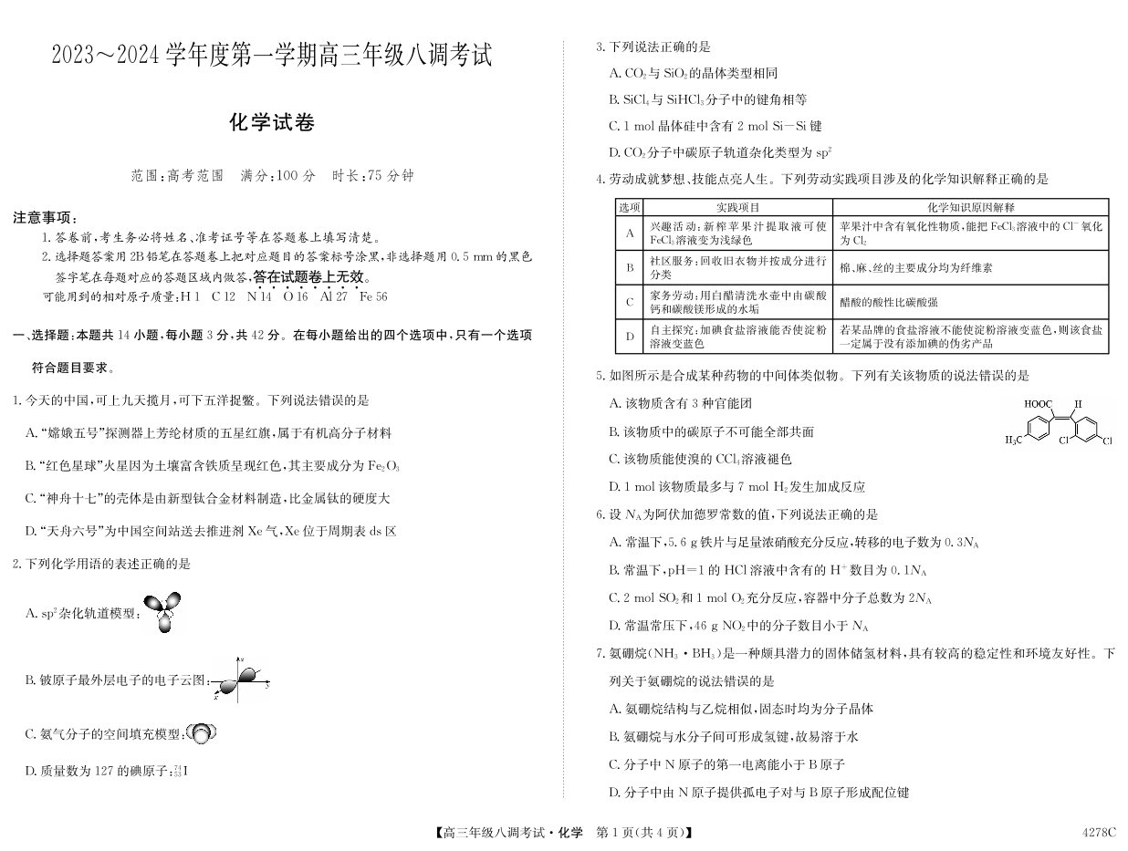 河北省邯郸市磁县第一中学2023-2024学年高三上学期八调考试 化学