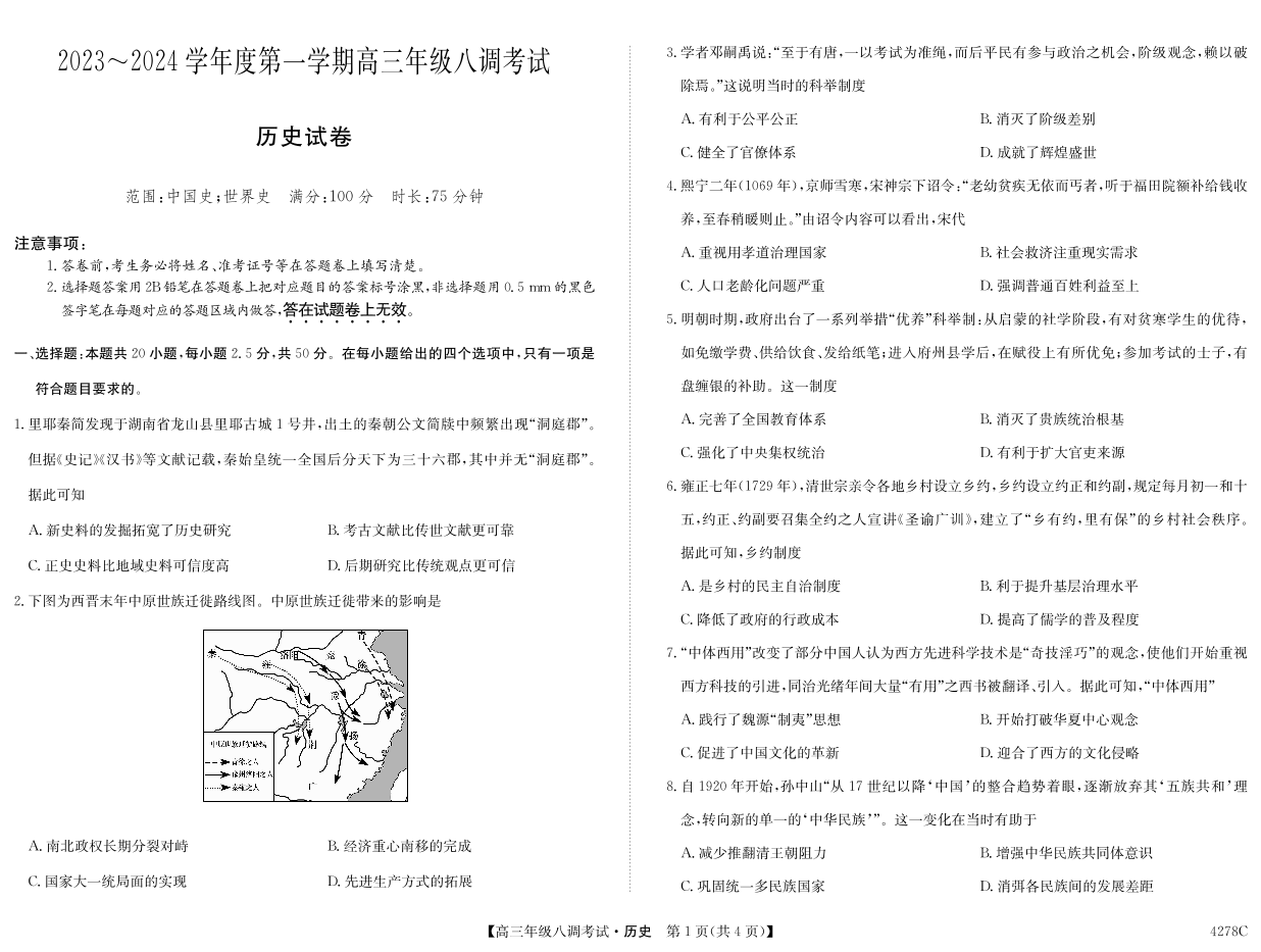 河北省邯郸市磁县第一中学2023-2024学年高三上学期八调考试 历史