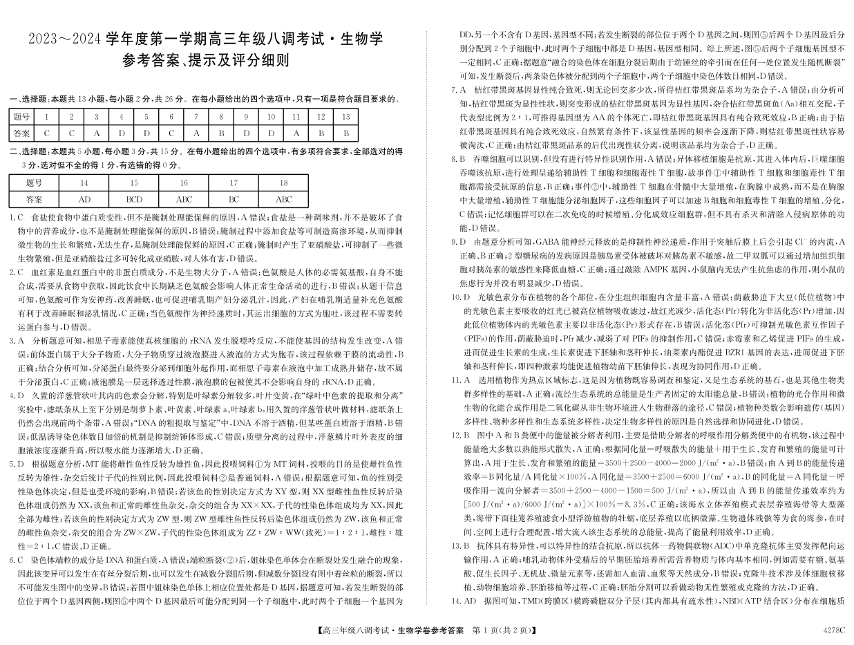 河北省邯郸市磁县第一中学2023-2024学年高三上学期八调考试 生物答案