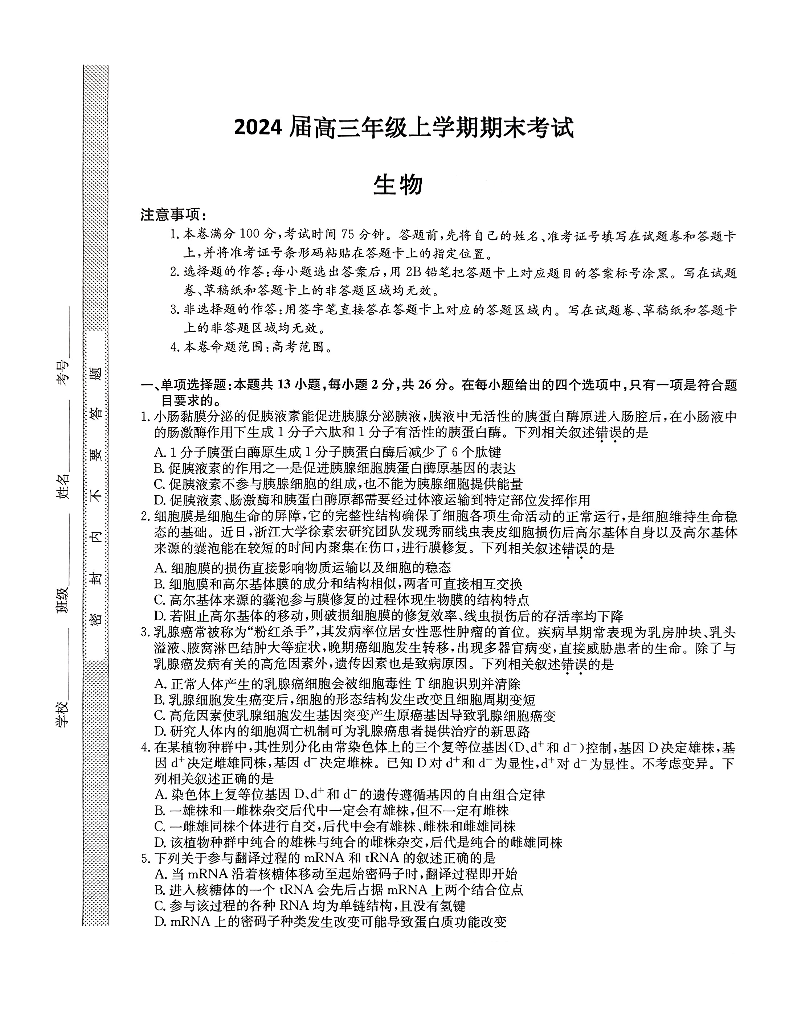 河北省唐县第一中学2023-2024学年高三上学期1月期末考试 生物