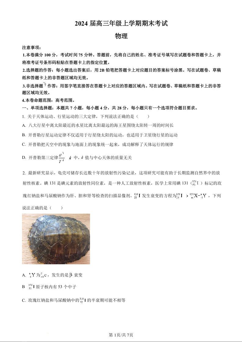 河北省唐县第一中学2023-2024学年高三上学期1月期末考试 物理