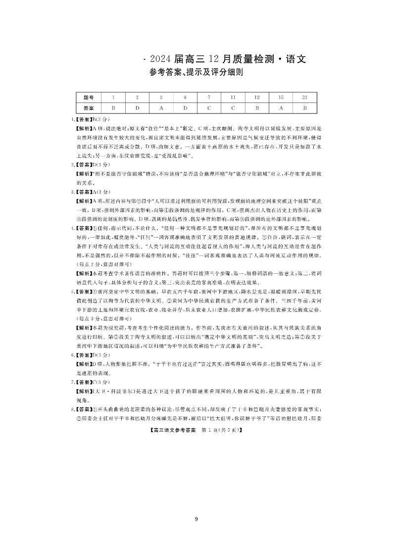 河北省定州市第二中学等校(金科大联考)2023-2024学年高三上学期12月质量检测 语文答案