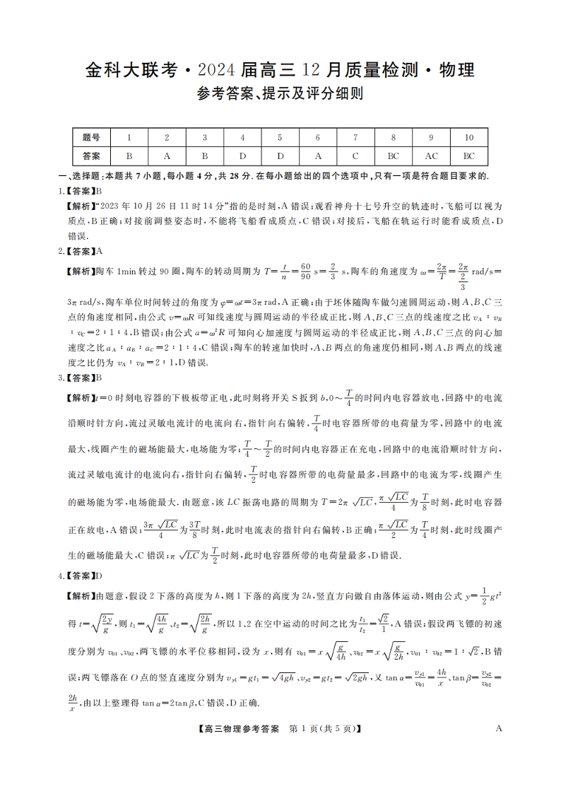 河北省定州市第二中学等校(金科大联考)2023-2024学年高三上学期12月质量检测 物理答案