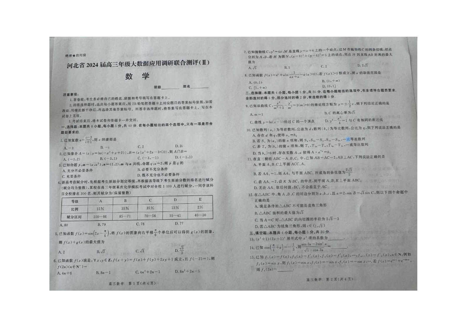 河北省2023-2024学年高三上学期大数据应用调研联合测评(III)数学