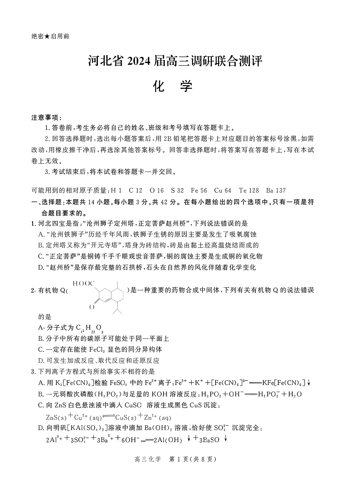 河北省2023-2024学年高三上学期大数据应用调研联合测评(III)化学