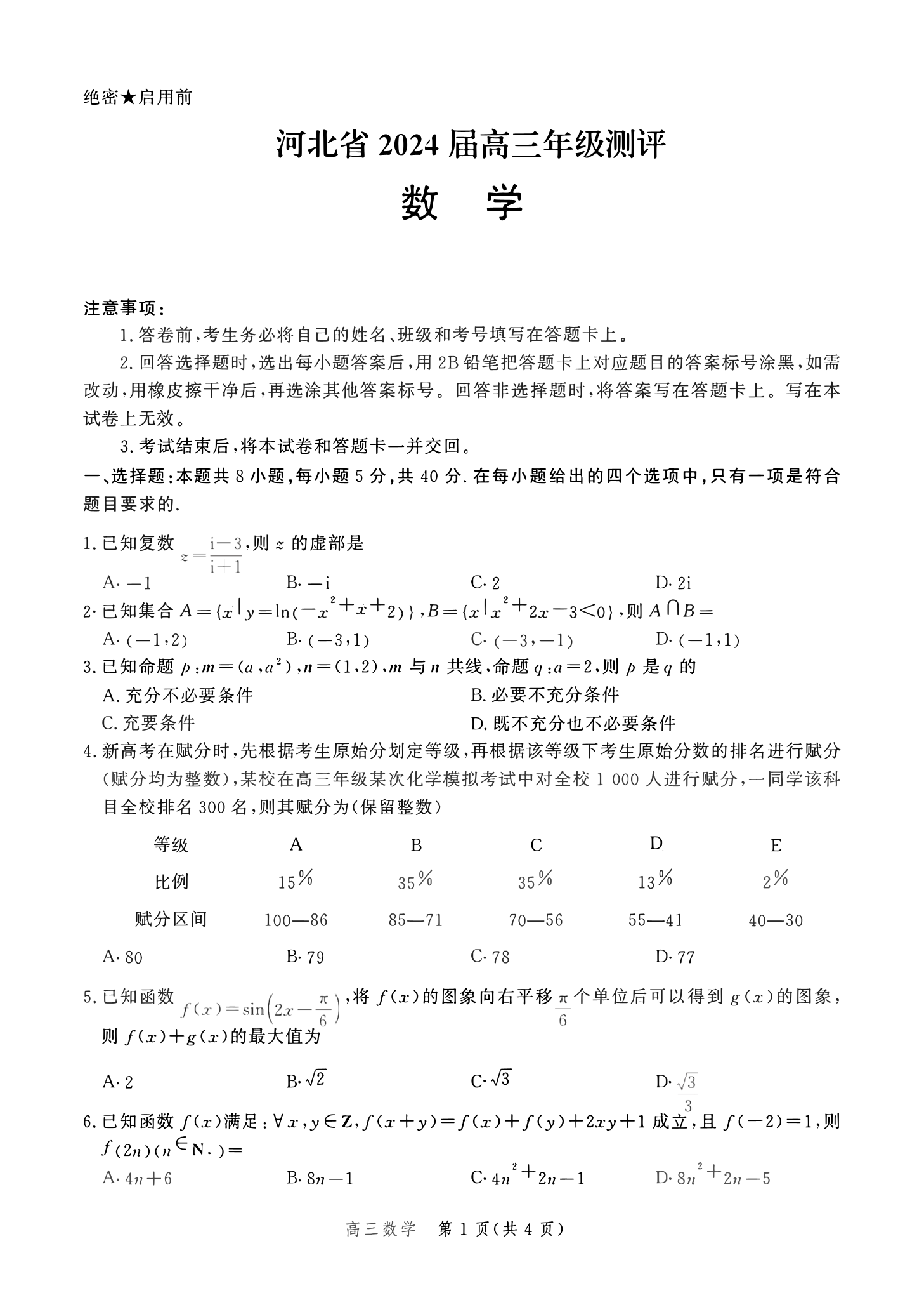 河北省保定市部分重点高中2023-2024学年高三上学期12月期末考试 数学