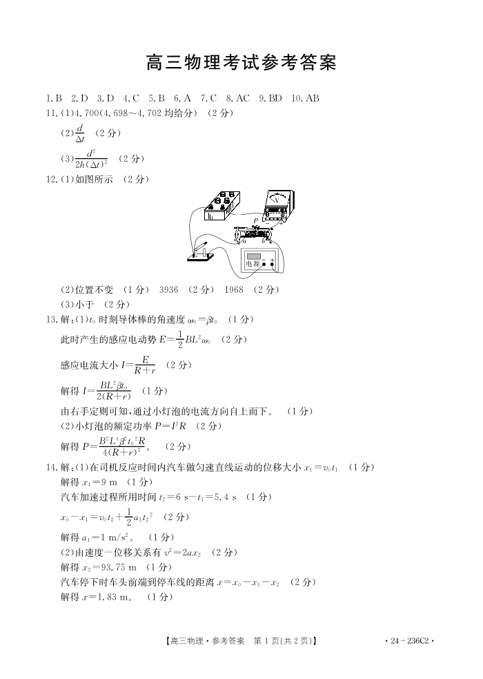 河北省保定市部分重点高中2023-2024学年高三上学期12月期末考试 物理答案