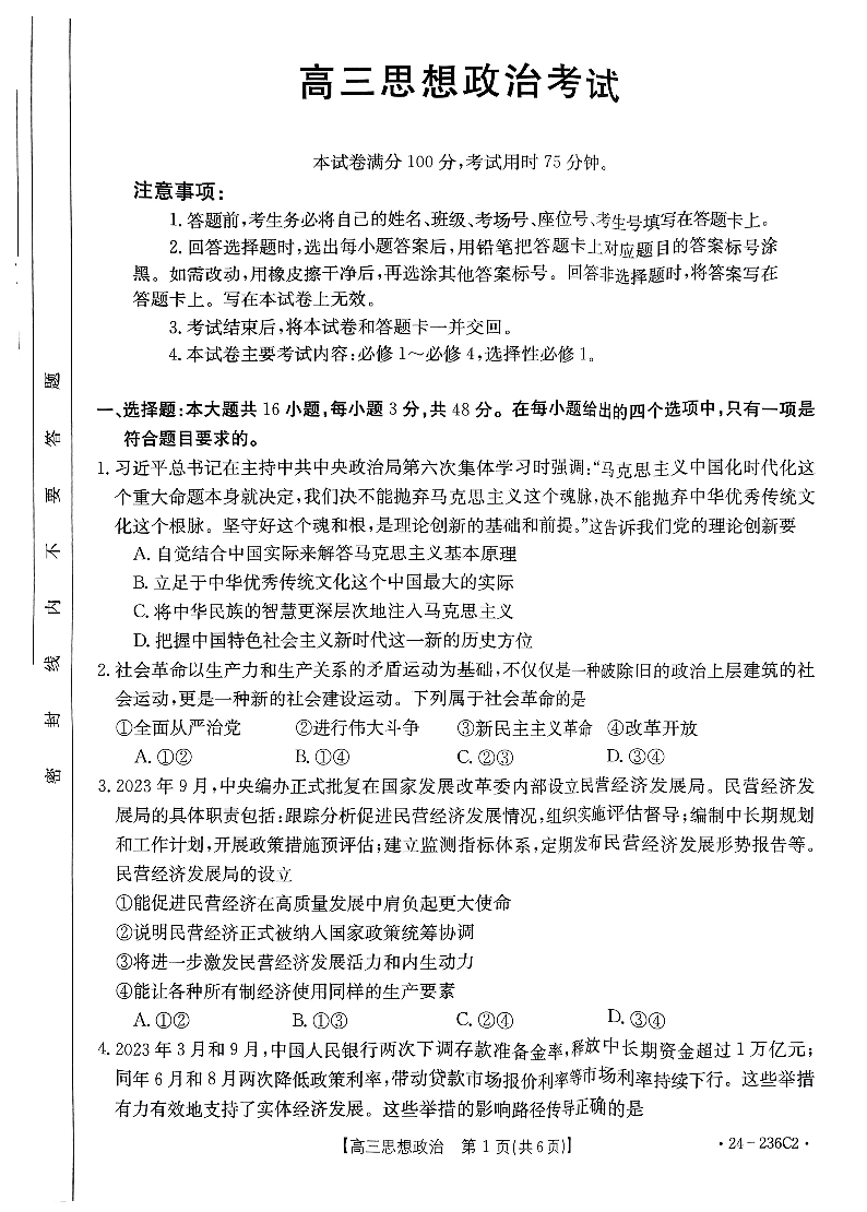 河北省保定市部分重点高中2023-2024学年高三上学期12月期末考试 政治