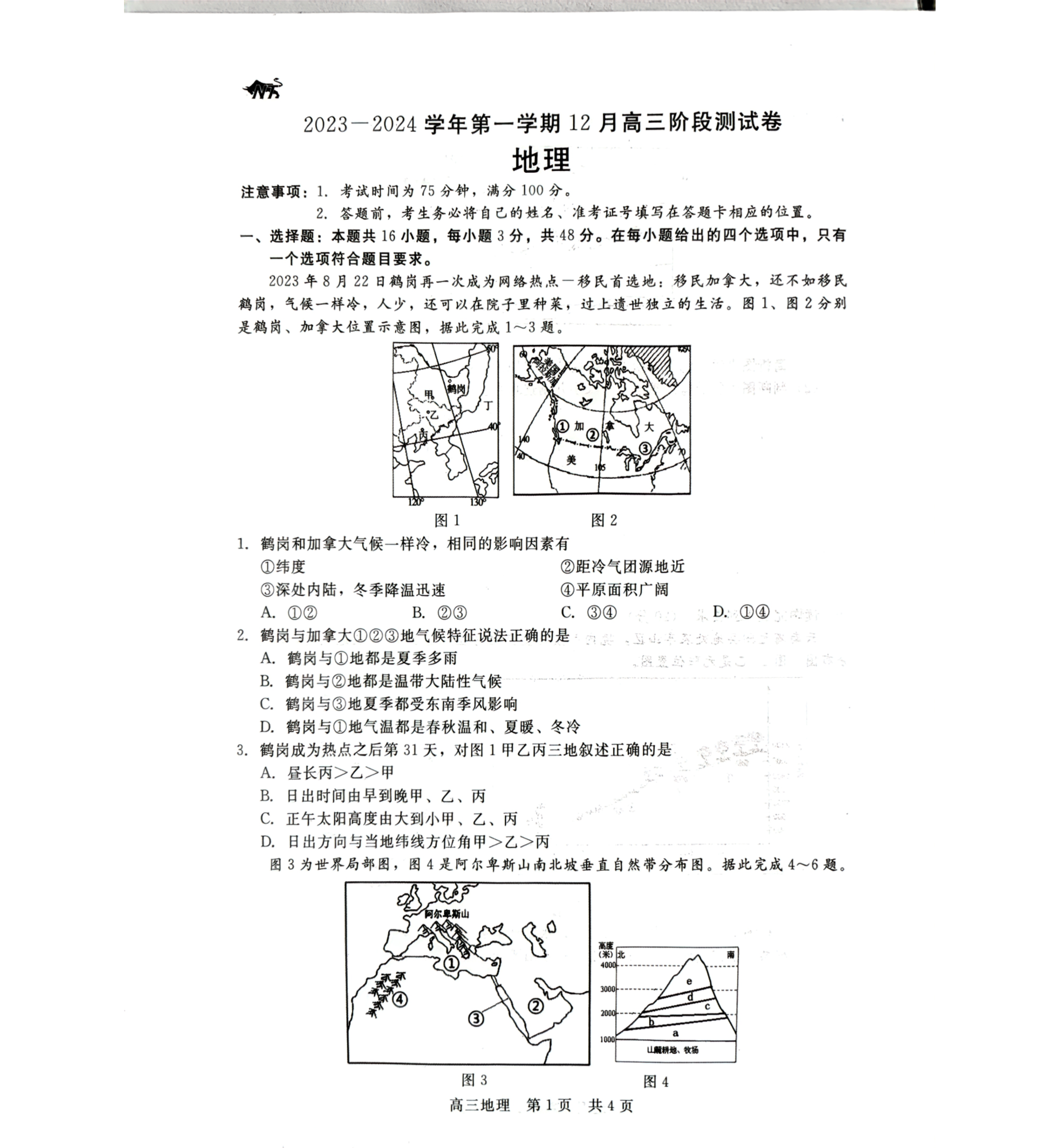 河北省张家口市张垣联盟2023-2024学年高三上学期12月阶段测试 地理