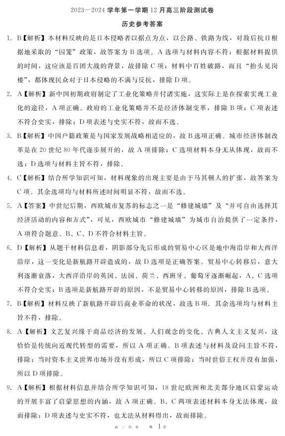 202312高三月考答案(历史)