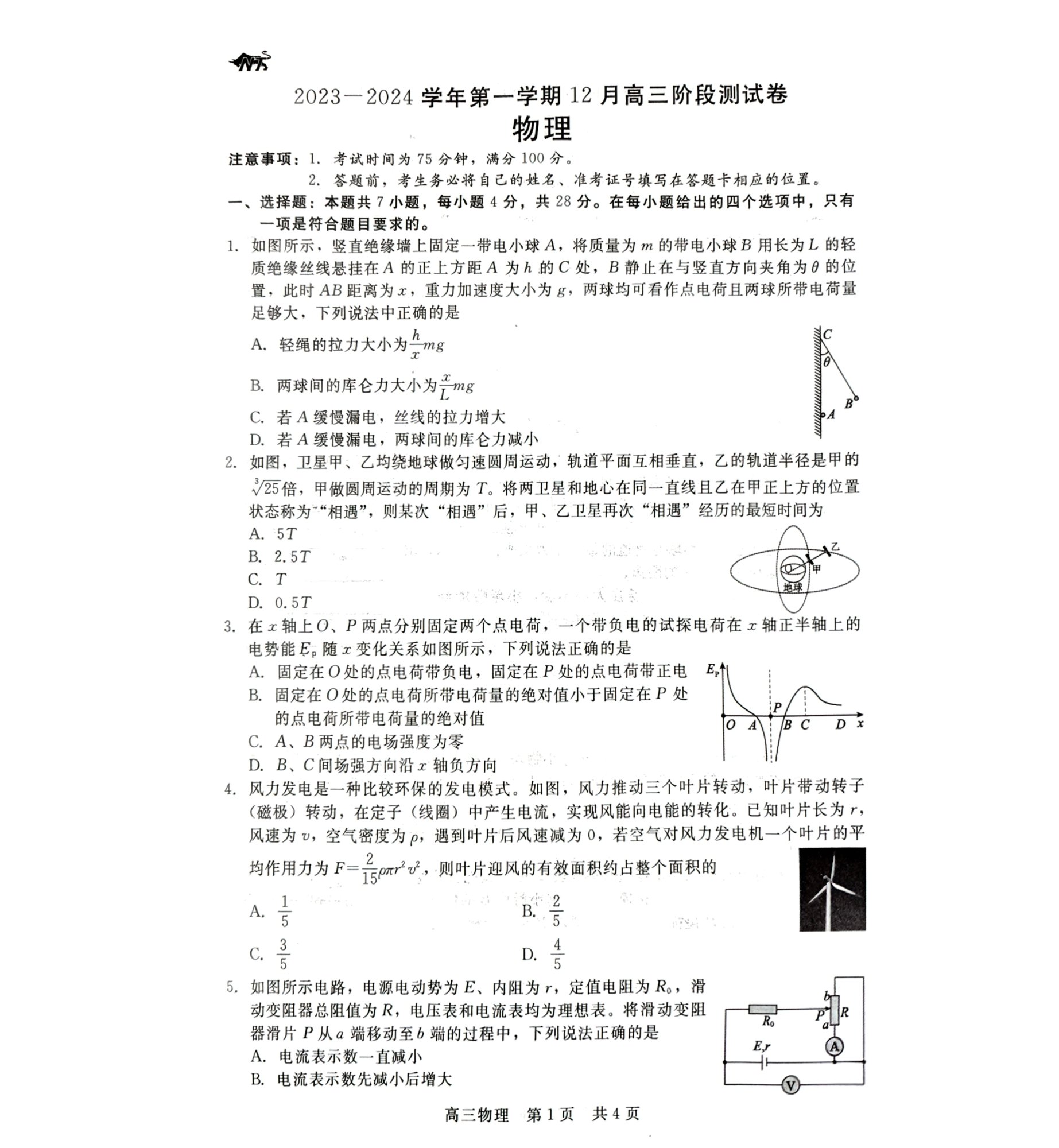 河北省张家口市张垣联盟2023-2024学年高三上学期12月阶段测试 物理