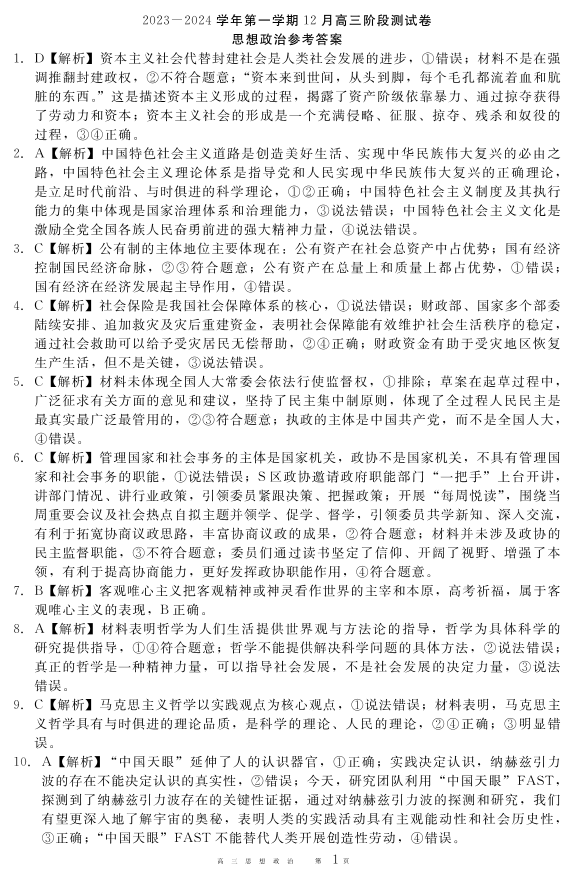 202312高三月考答案(政治)