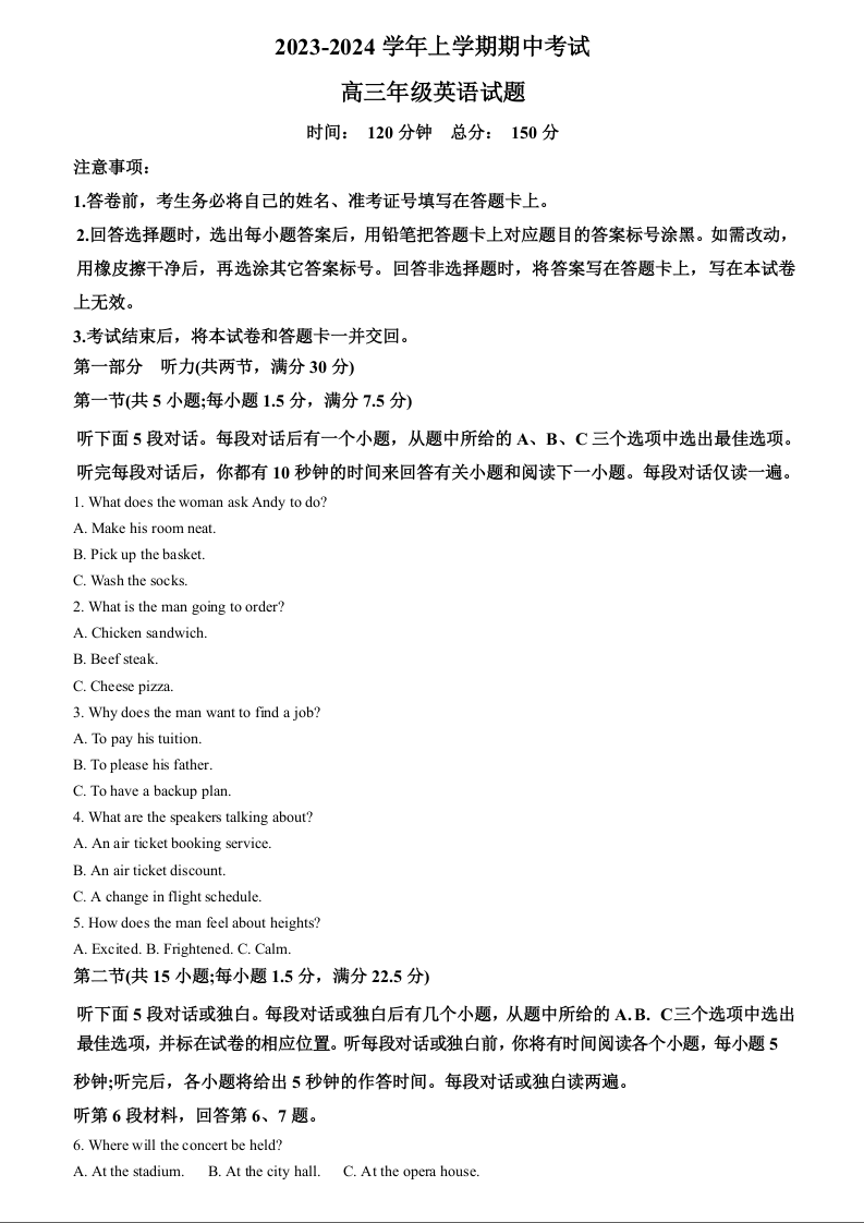 河北省衡水市冀州中学2023-2024学年高三上学期期中考试 英语