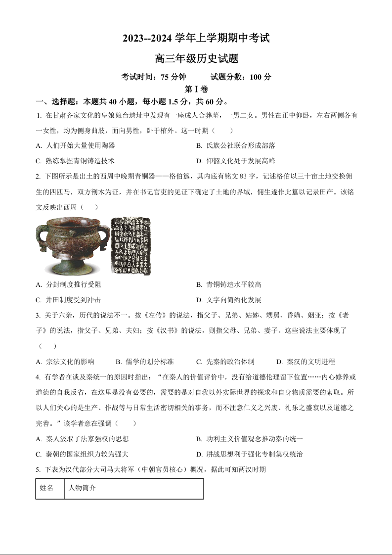 河北省衡水市冀州中学2023-2024学年高三上学期期中考试 历史